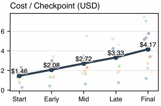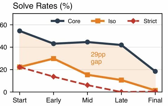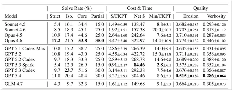 没有一个AI Agent能从头到尾完成任何一个问题的所有检查点,哪怕是当前最强的Claude Opus 4.6,严格通过率也只有17.2%——相当于做10个项目,8个半都是烂尾的。