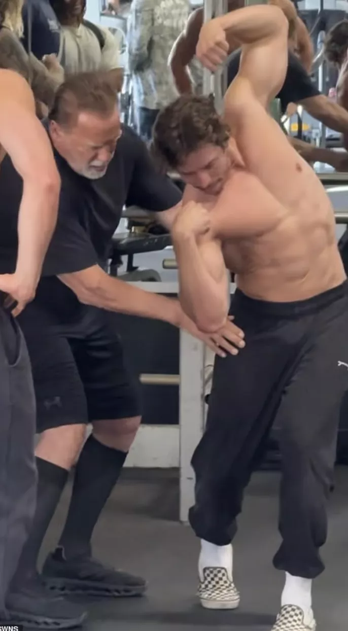 更巧的是,就在比赛前几天,他还被拍到在洛杉矶著名的 Gold’sGym(威尼斯海滩),与父亲一起训练。施瓦辛格亲自上阵,帮他调整动作、打磨经典姿势,现场甚至围满了围观人群。