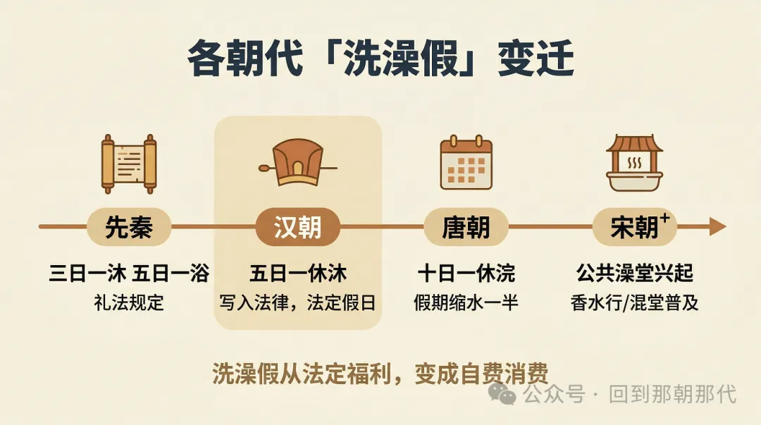 先秦那会儿就定下了"三日一沐,五日一浴"的规矩,"沐"是洗头,"浴"是洗身子,古人分得很细。到了汉朝,朝廷干脆把洗澡写进了法律----《汉律》规定"吏员五日一休沐",官员上五天班放一天假,专门回家洗澡。