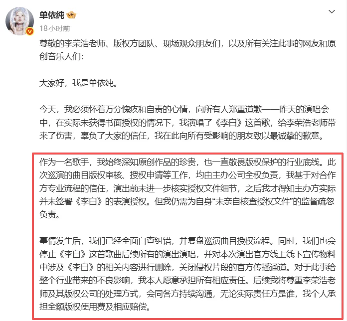 铁证摆在眼前,这时候,单依纯发长文道歉说“主办方负责版权审核,我没亲自核实”,还说要承担全额赔偿。听着挺诚恳,但这理由,听着怎么这么耳熟?版权审核这么大的事,真能稀里糊涂?