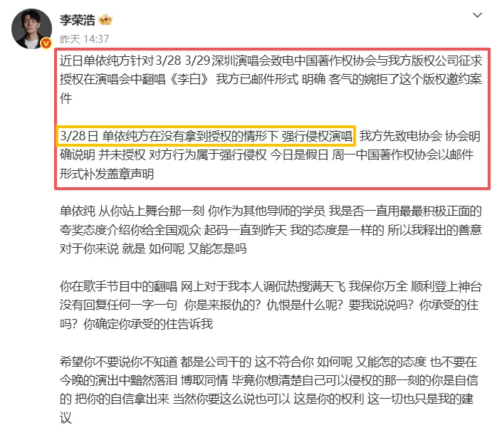 咱们先把时间拨回到3月28号,单依纯团队为了在深圳的这两场演唱会翻唱《李白》,确实通过中国音乐著作权协会走了一波流程,向李荣浩方申请了授权。这一步,做得没毛病,甚至可以说,态度是有的。