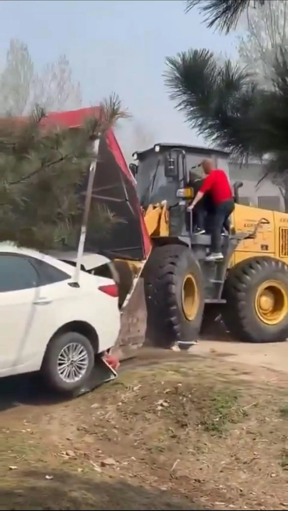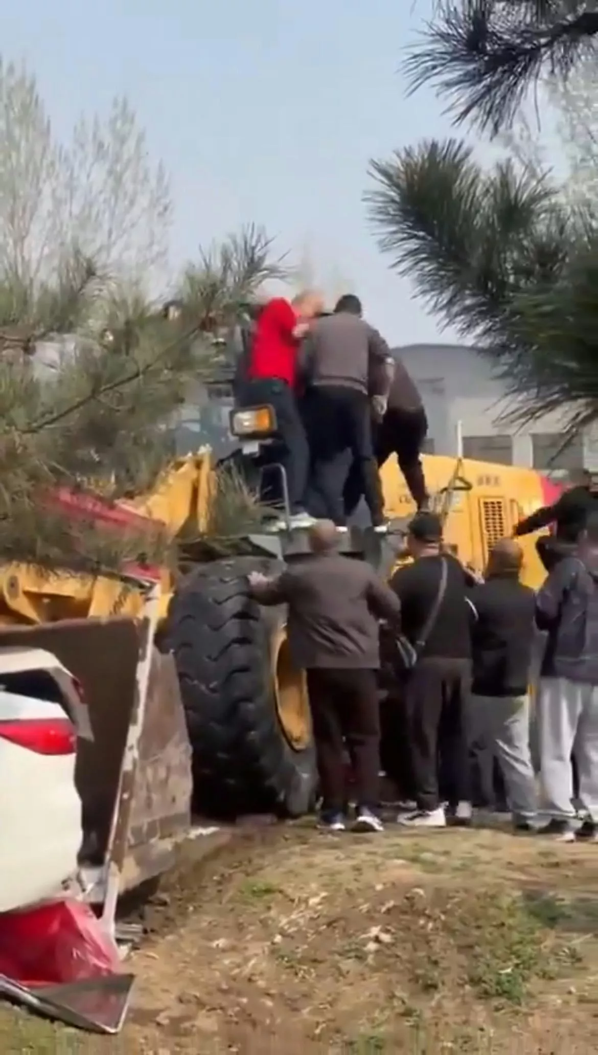 另一段视频显示,在铲泥车继续冲撞期间,有数名英勇民众冒险爬上正在行驶的车身,合力将驾驶室内的司机强行拖出。