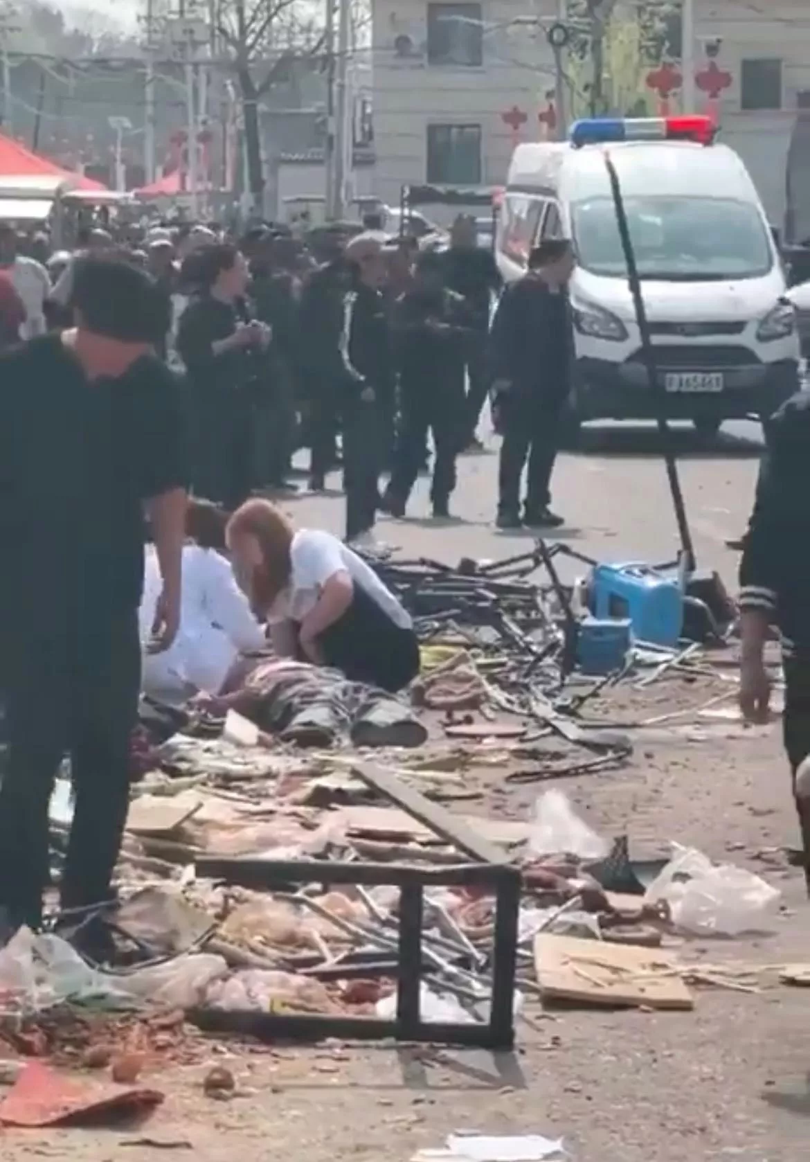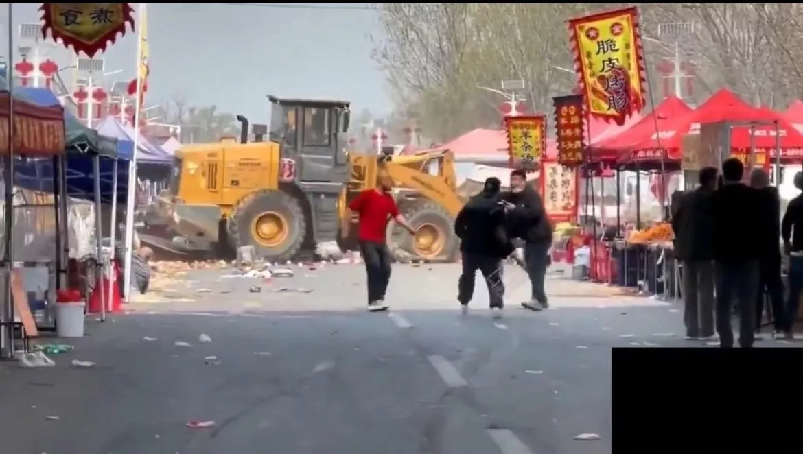 3月29日,一辆重型铲泥车在市集内横冲直撞,多名民众走避不及被辗压或撞倒。(X平台)