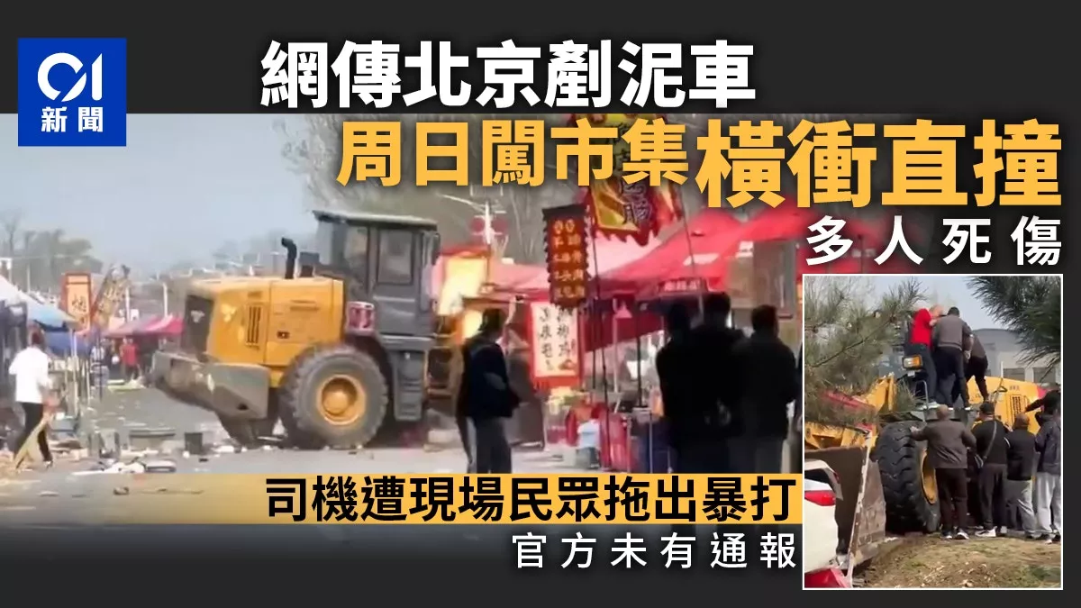 网传北京房山区传统农村市集“大韩继大集”于周日(29日)上午发生一宗铲泥车冲撞人群事故。网传视频显示,一辆重型铲泥车在市集内横冲直撞,多名民众走避不及被辗压或撞倒,现场目击者指有七、八人当场死亡,而肇事司机则遭现场民众拖在地上暴打。目前,官方未就事件进行通报。
