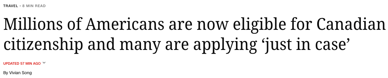 自加拿大《公民法》C-3号法案通过、放宽公民资格条件以来,已有数百万美国人有资格申请加拿大国籍。尤其在当前美国社会动荡、政治分裂加剧的背景下,为自己准备一个“备选方案”已成为许多人的现实选择。