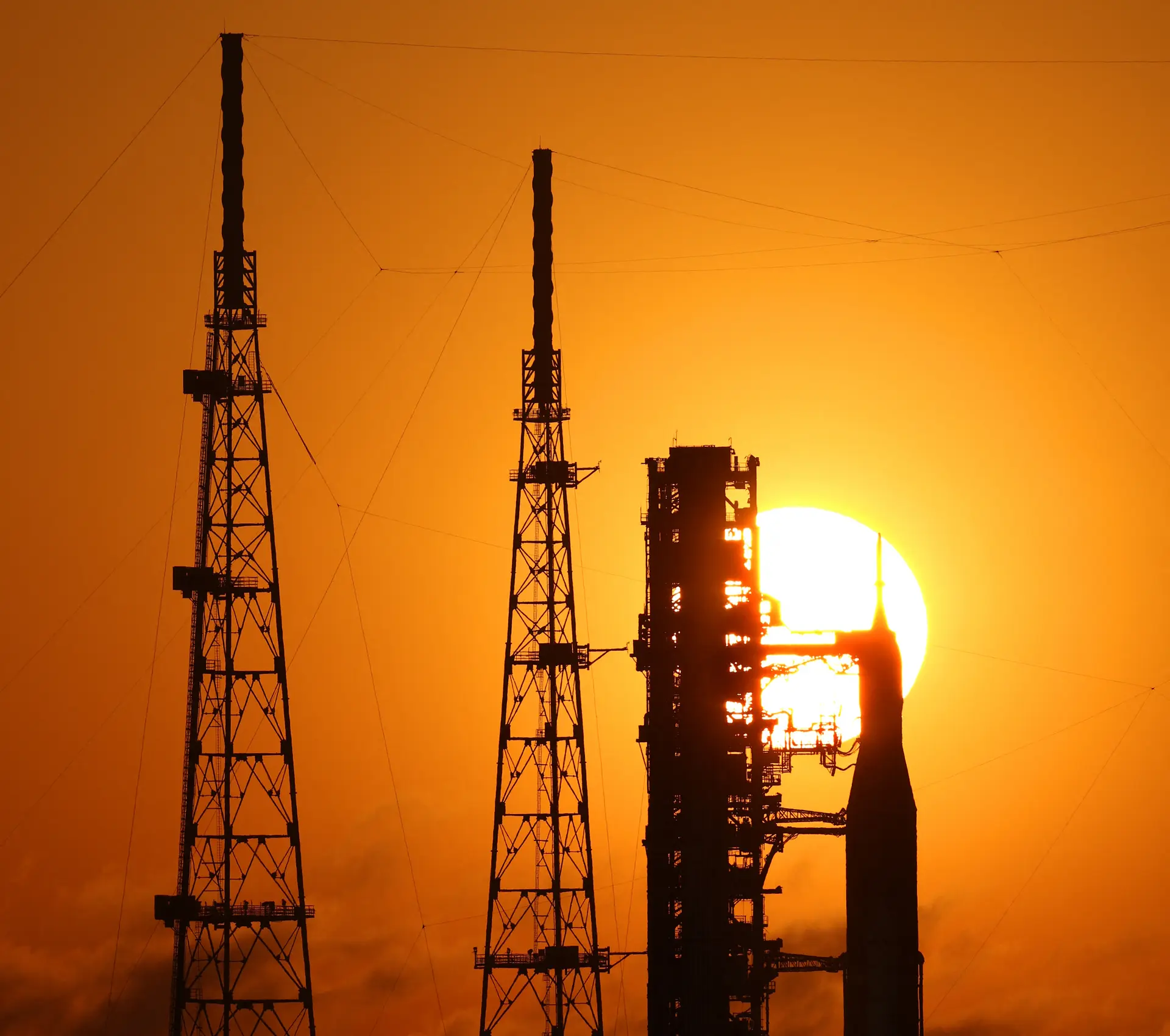 2026年3月24日,佛罗里达州卡纳维拉尔角的肯尼迪航天中心,39B发射台上的NASA“阿耳忒弥斯2号”太空发射系统(SLS)火箭和猎户座(Orion)飞船沐浴在晨光中。(Gregg Newton/AFP via Getty Images)