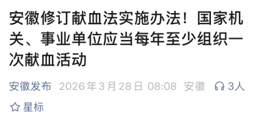 昨天吃饭的时候跟一朋友聊到了“安徽修订献血法实施办法”这件事,当地官方是准备从6月份开始实施,国家机关、事业单位应当每年至少组织一次献血活动。