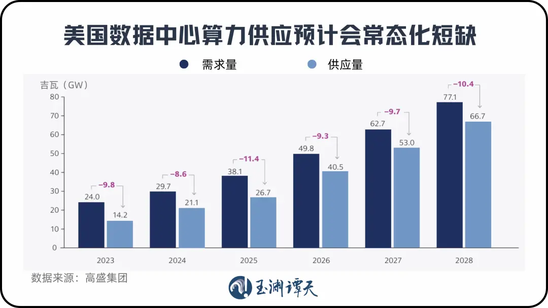 这两年美国一直在讲要建更多数据中心、继续扩张算力,但现实是供给始终追不上需求增长。根据高盛测算,美国数据中心算力供需缺口正呈现常态化趋势,未来几年预计也将长期维持在约10吉瓦的水平。