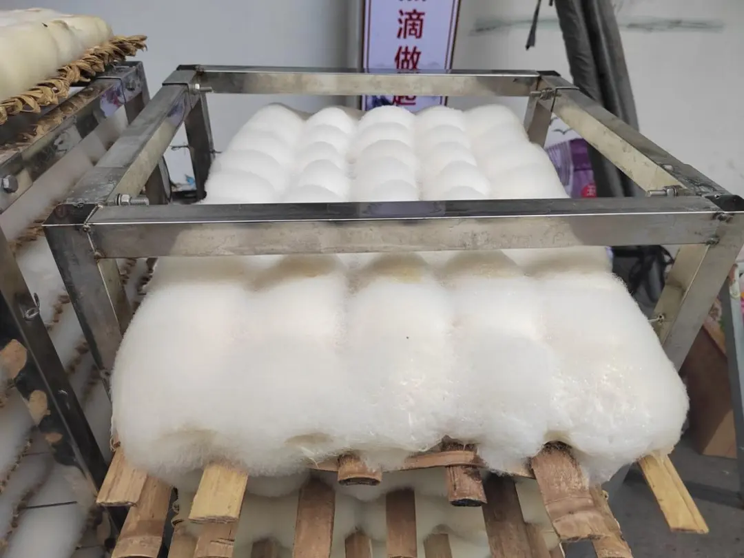 制作腐乳首先要选择品质好的大豆,将其制作成豆腐后切块摆盘,称为白胚。白胚通过接种微生物长出毛霉,让每个豆腐块都长满了“白毛毛”,称为毛胚。接下来还要搓毛、加盐腌制、加卤汤密封发酵。