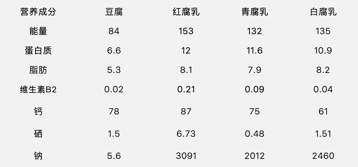 虽然腐乳的营养看起来很好,但也存在一个不可忽视的问题,那就是盐含量着实不低。根据《中国食物成分表》中的数据,红腐乳、青腐乳、白腐乳的钠含量分别高达 3091mg/100g、2012mg/100g、2460mg/100g,是豆腐钠含量的 350~550 倍。