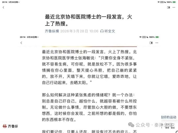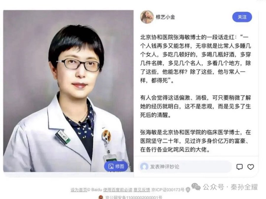 北京协和医院张海敏博士的一段话火了:“一个人钱再多又能怎样,无非就是比常人多睡几个女人,多吃几顿好的,多喝几瓶好酒,多穿几件名牌,多见几个名人,多看几个地方,除了这些,他能怎样?除了这些,他与常人一样,都得死。”