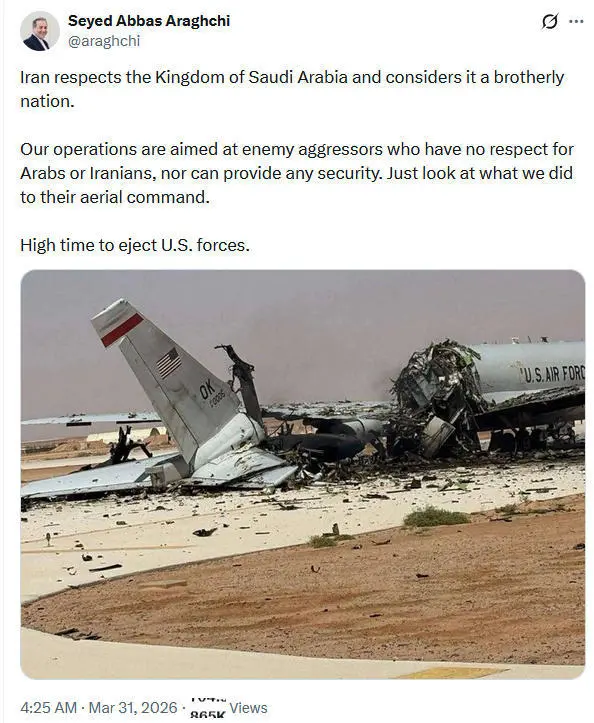 伊朗外长阿拉格齐3月30日在社交媒体X上发布了E-3预警机被摧毁的照片,并评论道:“伊朗尊重沙特阿拉伯王国,视其为兄弟国家。我们的行动针对的是那些不尊重阿拉伯人和伊朗人,也无法提供任何安全的敌对侵略者。看看我们对他们的空中指挥部做了什么就知道了。是时候驱逐美军了。”