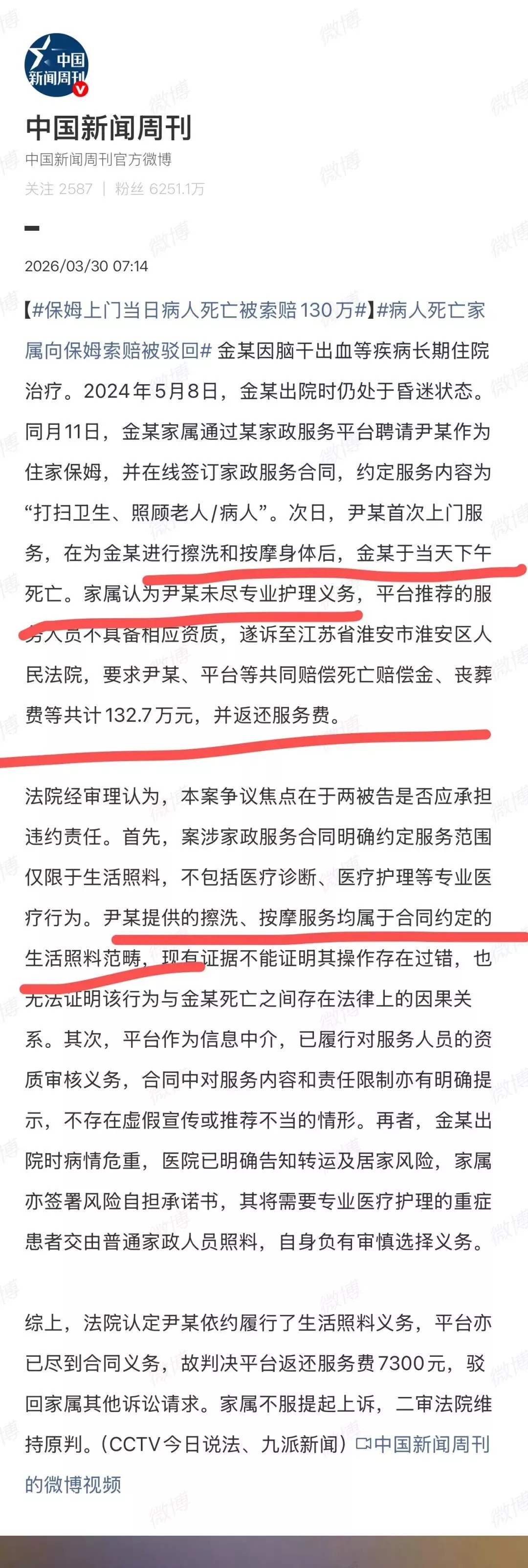 江苏淮安一个脑干出血的病人家属在将病人接回家后,突发奇想在网上找了一个住家保姆,然后保姆上门第一天,这位病人就去世了,而后家属的操作就是要求保姆和平台赔偿死亡费和丧葬费,以及退回服务费!