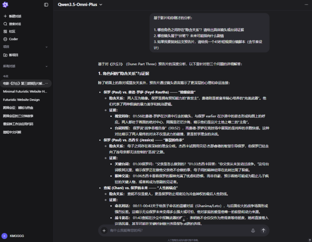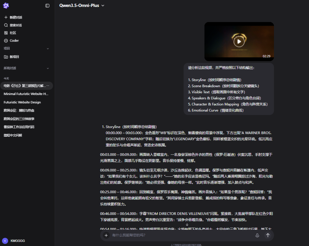我们选了没有字幕版的《沙丘》预告片作为第一个测试素材,来对Qwen3.5-Omni的多模态能力进行“极限测试”。