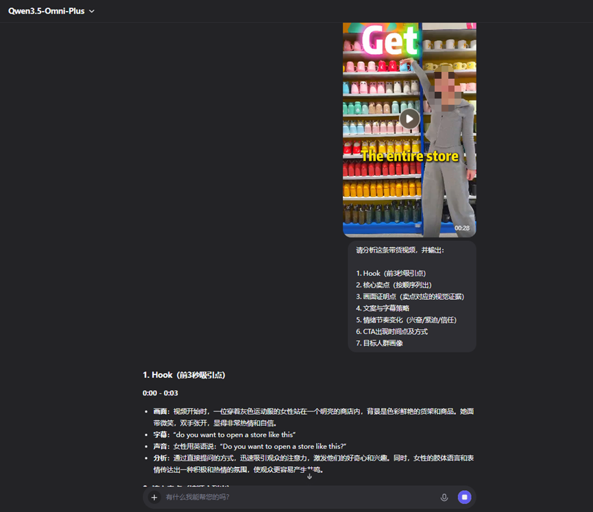 我们输入了一条义乌招商类TikTok爆款带货视频,要求Qwen3.5-Omni帮助我们拆解、复刻。
