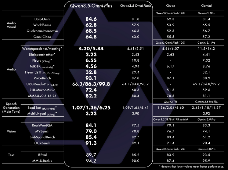 它是千问最新一代全模态大模型,采用混合注意力MoE架构,在海量文本、视觉及超过1亿小时的音频数据上做了原生多模态预训练,在215项第三方性能测试中取得SOTA,多项核心指标超越Gemini-3.1 Pro。