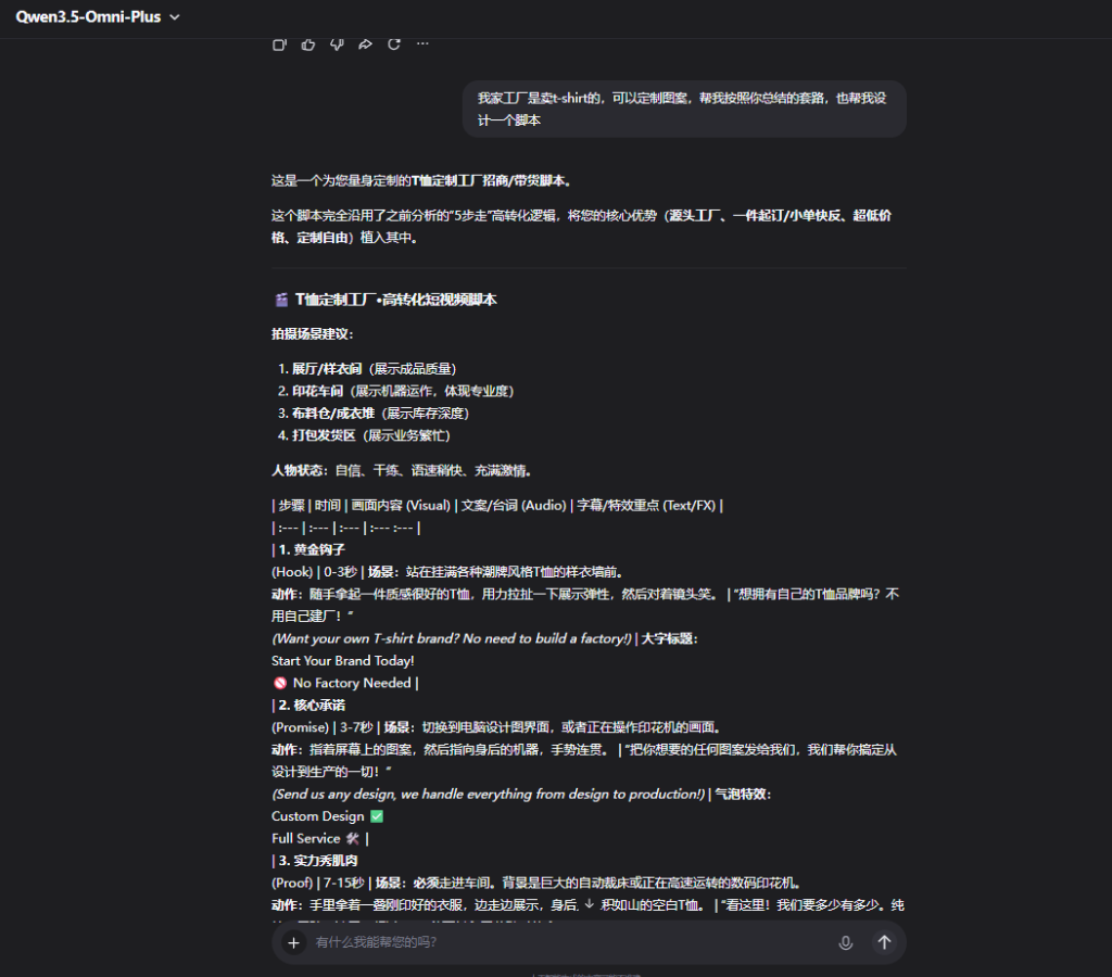 为了验证它是不是在生搬硬套营销学名词,我们告诉它,"我家工厂是卖T恤的,帮我按这个套路设计一个脚本",要求它把这套逻辑迁移到"T恤定制工厂"场景。