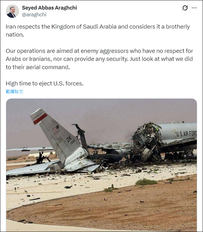 阿拉格齐30日在社交平台X发帖,喊话沙特阿拉伯驱逐美军,并配上了一张美军飞机严重受损的图像。