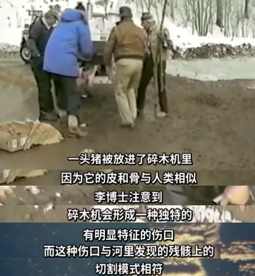其二,李昌钰带着团队,用碎木机打碎树枝和冻僵的猪肉,得到的猪肉碎片和湖中找到的人体碎片,形状高度相似。