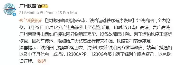 事后,广州铁路发文通报,此次是受强降雨龙卷风影响,相关路段列车接触网挂异物,并表示“铁路部门第一时间启动应急预案,进行紧急抢修”。