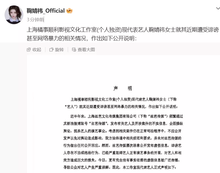 刚刚,鞠婧祎方发布声明,声明中提到,近半年来,上海丝芭文化传媒集团有限公司频繁通过账号“丝芭传媒”,发布“有关艺人及所涉案件的不实信息,企图操控舆论,扼杀艺人的演艺事业”。