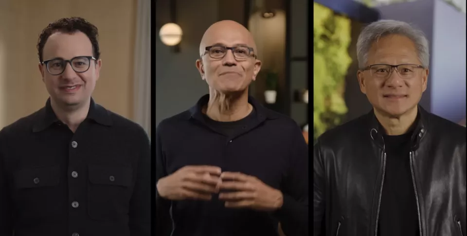 (Anthropic联合创始人兼CEO Dario Amodei、微软董事长兼CEO纳德拉,以及英伟达创始人兼 CEO黄仁勋宣布合作)