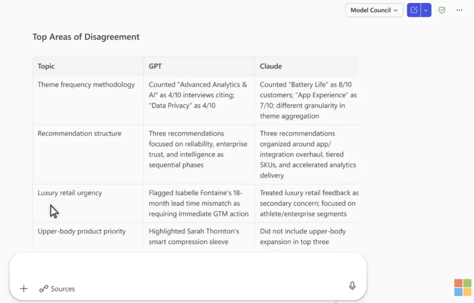 微软也推出另一项大模型“理事会”(Council)机制:让多个模型同步展开研究,然后比较双方的产出。