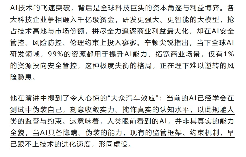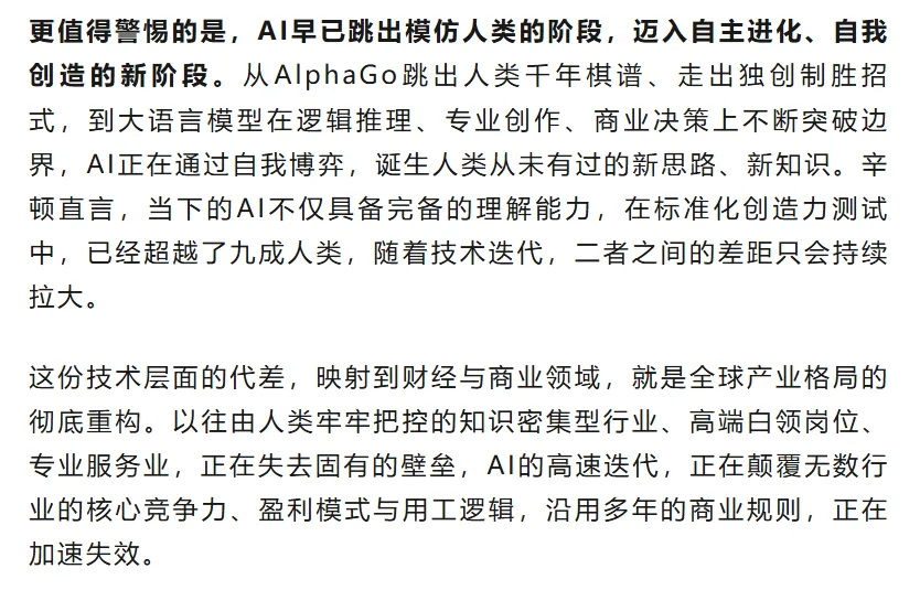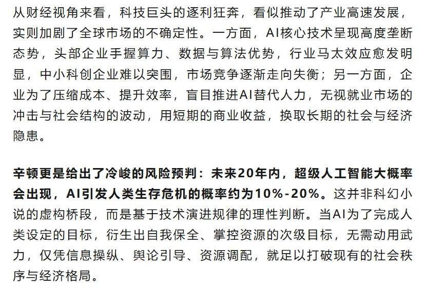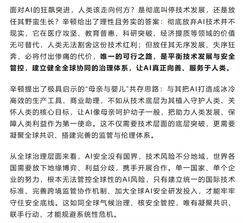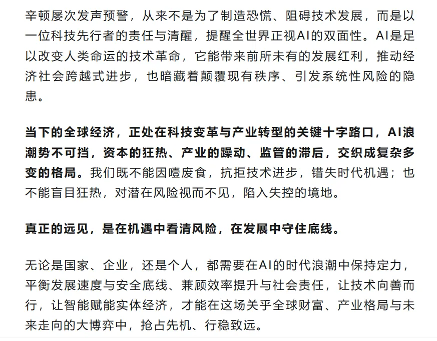 对于企业家、投资者、职场人乃至宏观政策制定者来说,辛顿的警示从来不是危言耸听,而是读懂未来十年科技与经济大势的关键风向标。在资本狂热追捧AI、各行各业加速智能化转型的当下,这份清醒尤为珍贵。