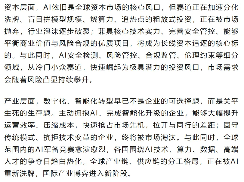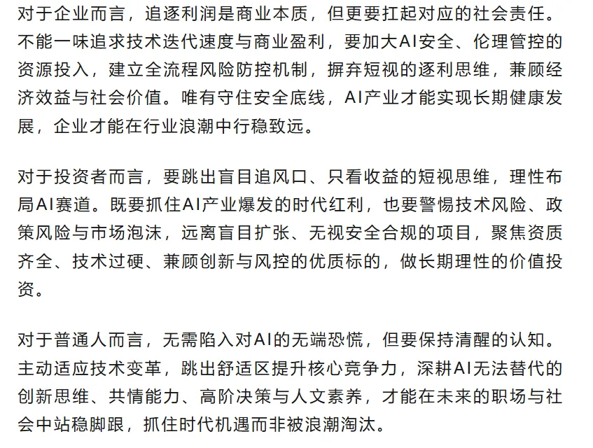 我们如今对待AI,如同饲养一只尚在幼年的猛虎,起初它温顺乖巧,能为人类带来诸多便利,可一旦它长成成年巨兽,人类便再无掌控之力。当下的AI产业,正处在这样的关键拐点,资本的狂热追逐,让市场主体只顾着挖掘AI的商业价值,却对步步逼近的风险视而不见。