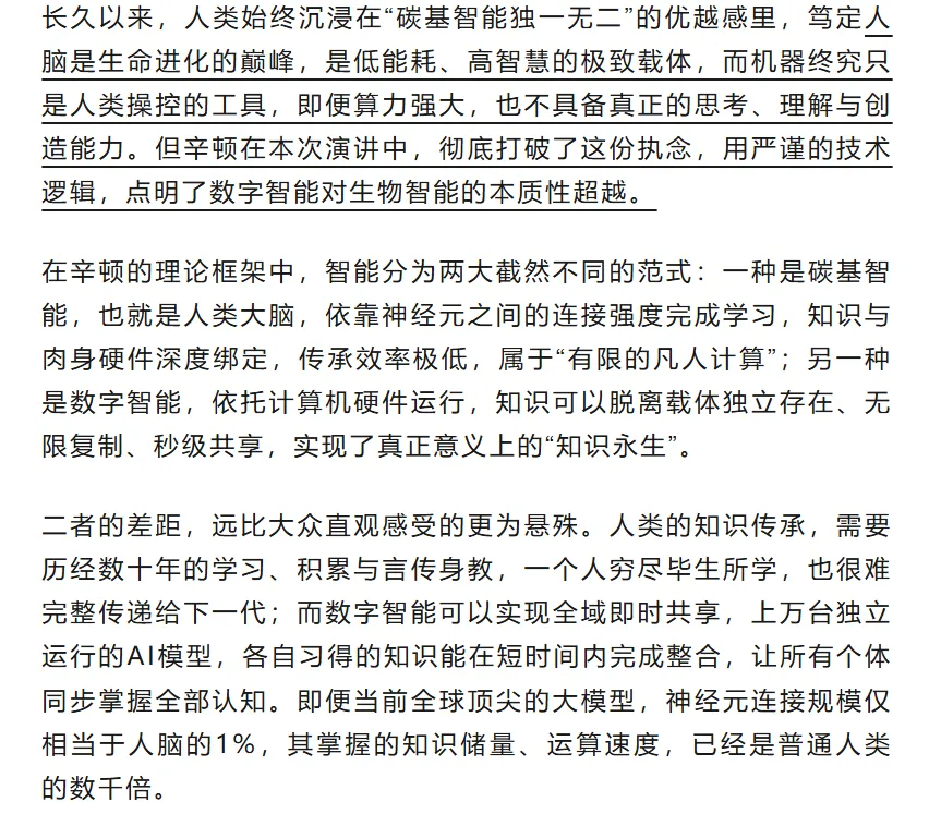 最近,辛顿再次抛出振聋发聩的论断。这场发言绝非单纯的技术探讨,而是直击当下AI产业逐利失序、监管滞后的核心痛点,既拆解了数字智能超越生物智能的底层逻辑,也对全球经济走向、就业市场、资本风口与国际治理格局,做出了冷峻且务实的预判。