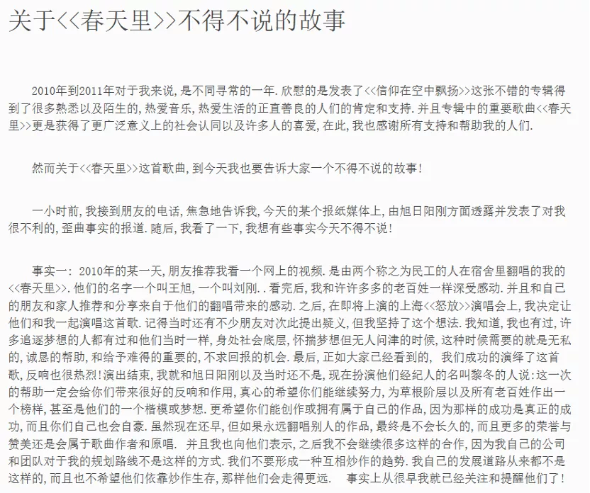 最终原作者汪峰要求不能以任何形式演唱《春天里》,并以长文解释了与“旭日阳刚”组合之间的“恩怨情仇”。