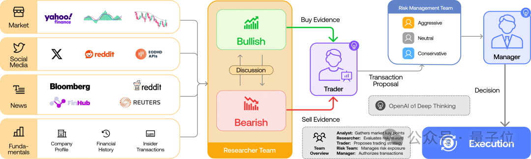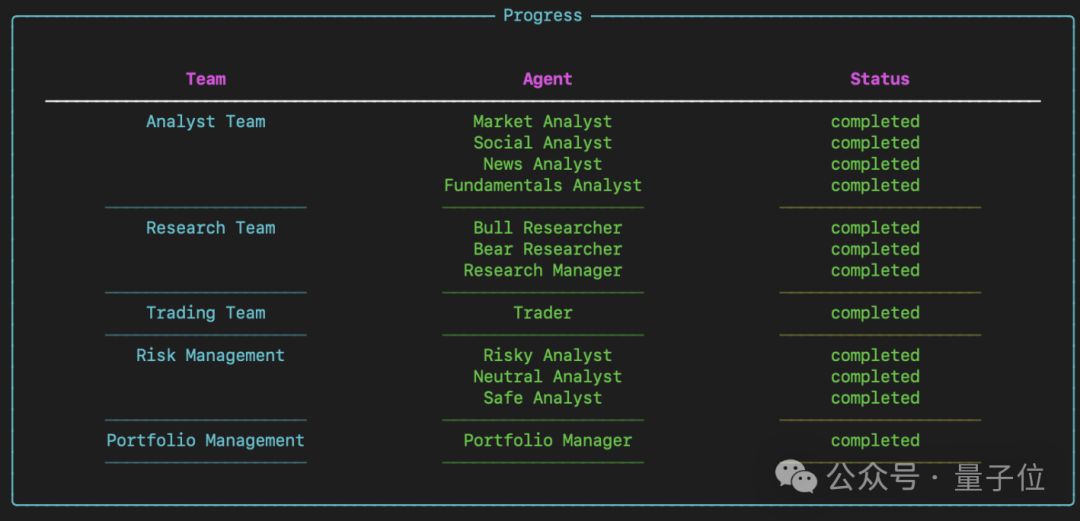 它的玩法很简单,在系统里设好几个专业角色协同干活,有基本面分析师、情绪分析师、技术分析师、研究员、交易员、风险管理师……这些角色扒完信息、经过一番评估讨论之后,最终再一起拍板要不要交易。