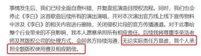 她称后续将停止《李白》这首歌曲所有的演出演唱,“我个人承担全额版权使用费及相应赔偿。”