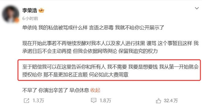 显然,李荣浩对这封充满公关口吻的道歉信,并不满意。他随即回应道:“我不需要,我要是想要钱,我从第一开始就会授权给你,那不是更加名正言顺?何必如此大费周章。”