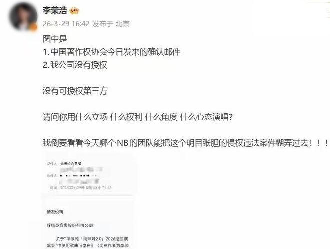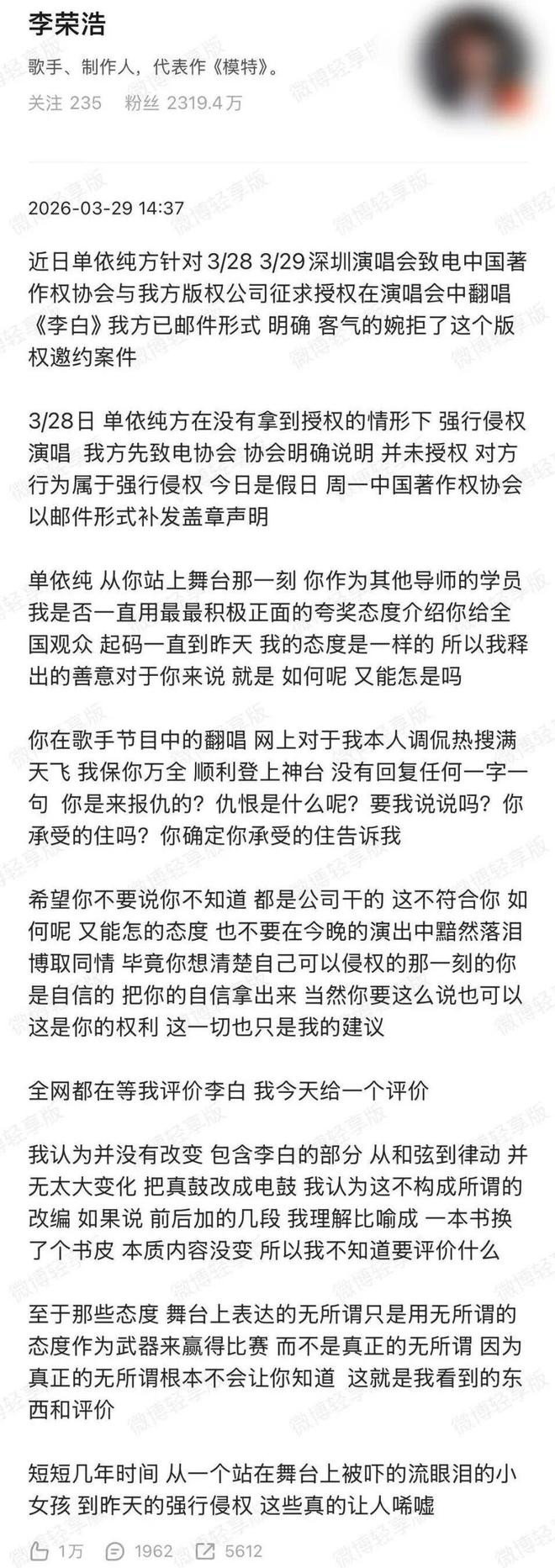3月29日,李荣浩突然在微博发文“手撕”单依纯,称对方在演唱会上唱《李白》,这属于强行侵权。