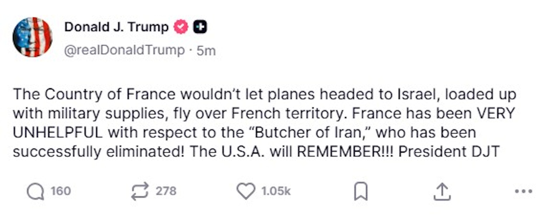 这位美国总统也在另一帖文批评法国拒帮忙,「法国拒绝允许满载军事物资、飞往以色列(专题)的军机飞越其领空。在关于已成功铲除的『伊朗屠夫』一事上,法国非常无用!美国将记住! ! !」