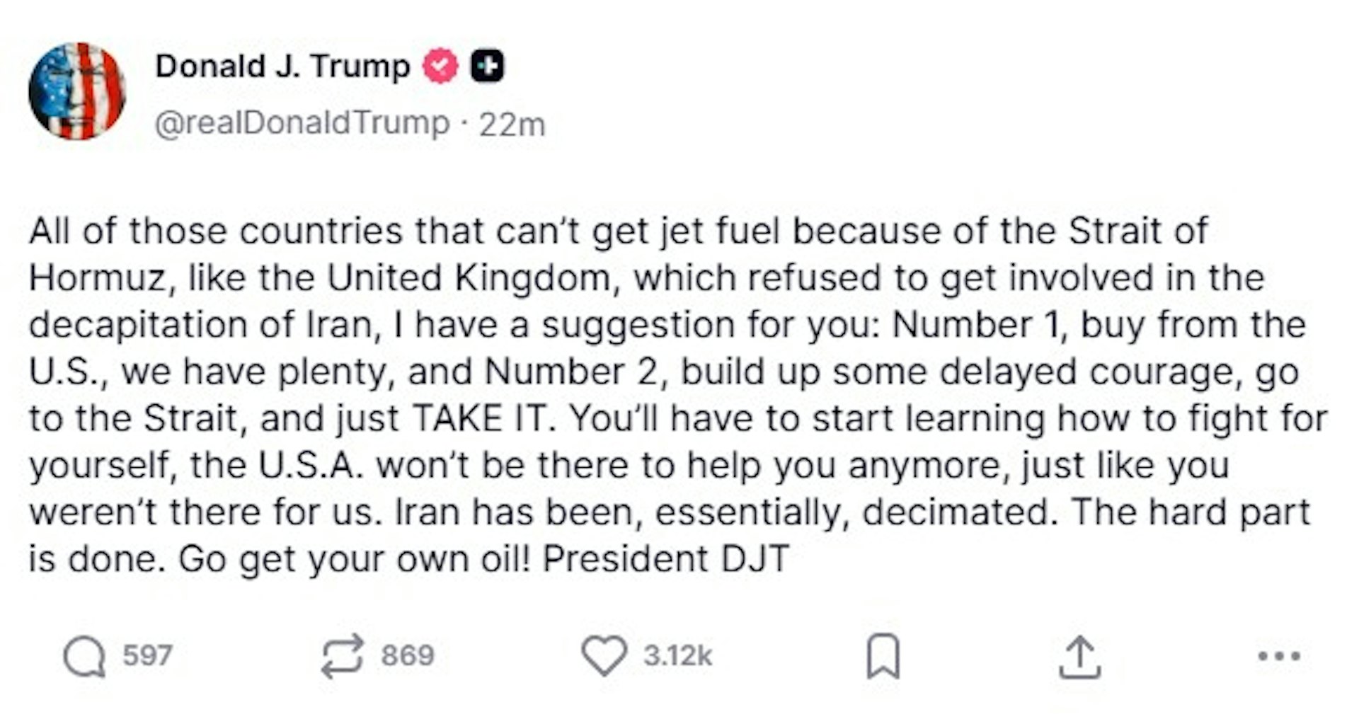 特朗普又在帖文指,「你们须开始去学为自己而战,美国不会再为你们伸援手,就如你们不站在我们这边一样。伊朗已遭重创,最艰难的阶段已经过去。自己的石油自己拿!(Go get your own oil!)」