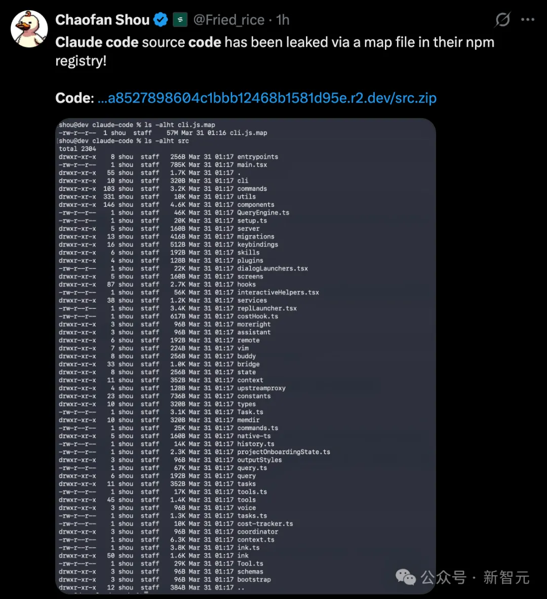 Chaofan Shoud提供的泄露截图,展示了一个@anthropic-ai/claude-code的公开包。