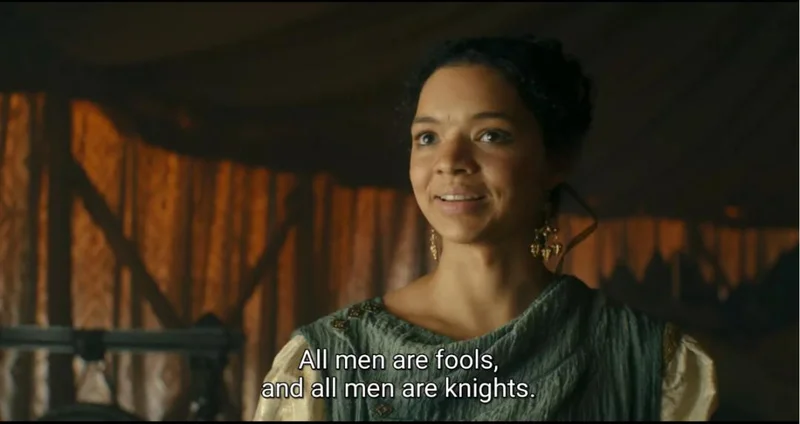 坦茜莉面对羞涩的邓肯,回了一句木偶戏里的台词,巧妙地回应了尴尬:“所有的男人都是弄臣,所有男人也都是骑士。”(All men are fools, and all men are knights.)