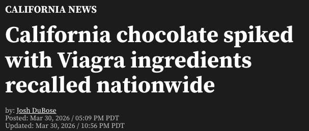 美国食品药品监督管理局(FDA)宣布,加州北部一家销售成人情趣产品的公司正自愿召回两款巧克力产品,原因是检测发现其含有可能达到“危及生命”水平的勃起功能障碍处方药成分。