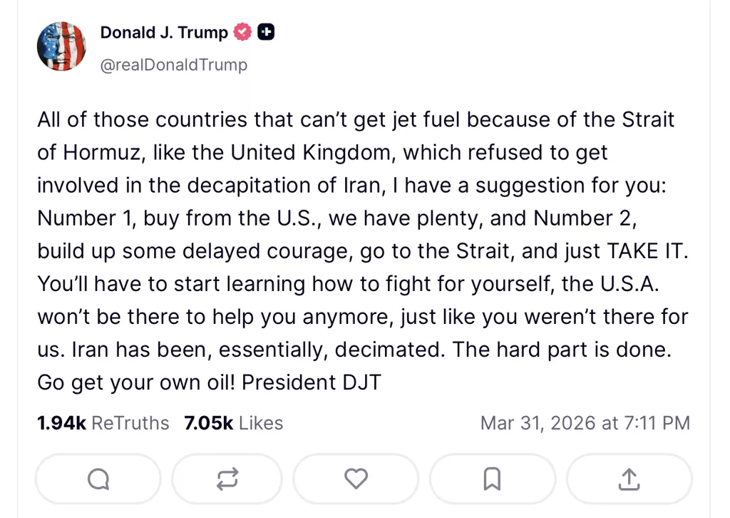 川普叫盟友国家想要石油自己去抢。(TruthSocial)