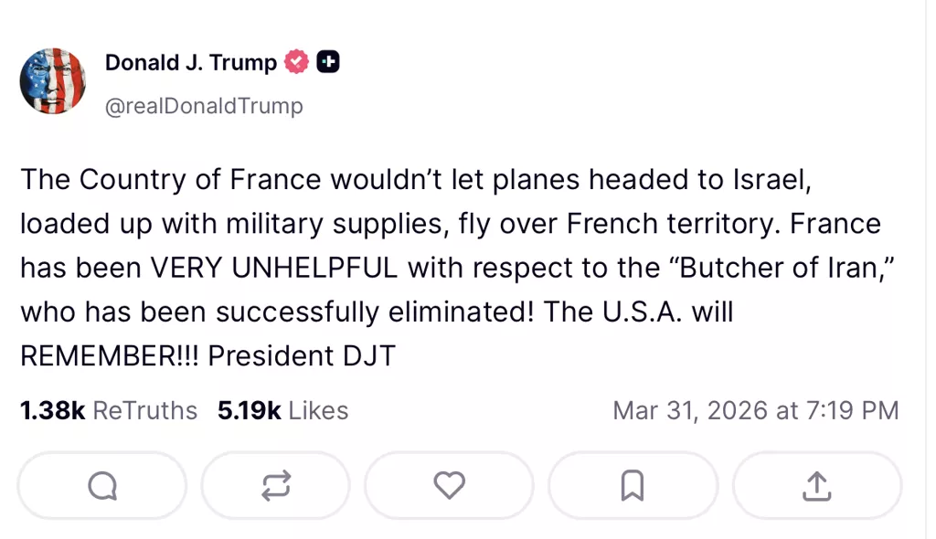 上一则贴文发布8分钟之后,川普又发文指控法国拒绝让载有军事物资、支援以色列的美方飞机通过领空,并因此公开批评巴黎“很不帮忙”(Veryunhelpful):“法国不让满载军需品飞往以色列的飞机越过法国领空。在已成功歼灭的『伊朗屠夫』的这个层面,法国一直很不帮忙!美国会牢牢记住此事。”