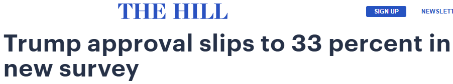 根据麻萨诸塞大学阿默斯特分校周一发布的一项民调,33%的受访者表示认可川普的执政表现。在62%表示不认可其执政表现的人中,有53%表达了“强烈”不满。