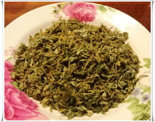 做法:将新鲜艾叶去掉硬梗、枯叶,用清水将泥沙淘净,然后按1千克艾叶拌250克面粉的比例,铺入笼屉蒸约30~40分钟后出锅。蒸熟的艾叶呈灰白色,无浓烈的芳香药味。再盛在碗里,调入以香油、辣面、葱、蒜泥等调制的味料即成。
