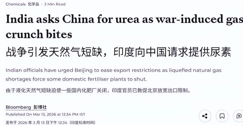 最先感受到阵痛的,正是14亿人口大国印度。作为世界上最依赖进口天然气生产化肥的大国之一,印度农业体系一下被卡住“脖子”,要知道,天然气是印度生产尿素的核心原料,没有天然气,尿素厂就等于断了“口粮”,根本开不了工。