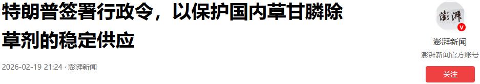 2026年2月,特朗普(专题)政府直接援引《国防生产法》签署行政令,把磷肥和草甘膦列入了国防关键战略物资,和稀土、芯片放在同一个级别。