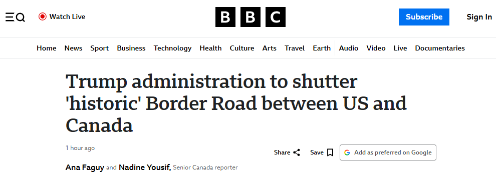 美加“边境公路”7月1日将关闭BBC