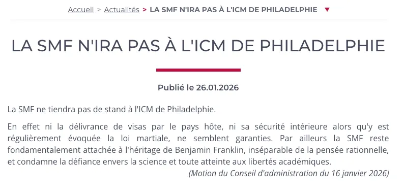 但数学家们正在用脚投票。首先是,早在请愿书发起之前,法国数学学会(SMF)率先做出了机构层面的表态。其于2026年1月16日召开理事会通过决议,不会在费城ICM上设立展台。此事引发数学界巨大震动。然后有了这次愈演愈烈的请愿书事件。