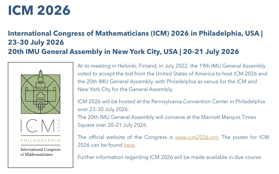 2026年的ICM现定于7月23日至30日在美国费城举行。这是40年来ICM再次回到美国,上一次是1986年的伯克利大会。这届大会恰逢美国《独立宣言》签署250周年,组委会由15位美国数学家组成,西蒙斯基金会提供了重要的资金支持。大会的学术项目结构委员会由菲尔兹奖得主马丁·海雷尔(Martin Hairer)担任主席。