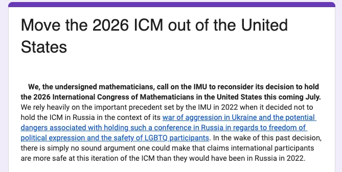 2022年,ICM原定在俄罗斯圣彼得堡举办。俄乌冲突爆发后,ICM的主办方国际数学联盟(International Mathematical Union,简称IMU)决定将大会改为线上举行,仅在芬兰赫尔辛基举办了一场小型颁奖典礼。请愿书指出,IMU当年已经接受了“东道国政治环境会影响会议安全与包容性”这一判断逻辑,因此同样的标准必须适用于当前的美国。